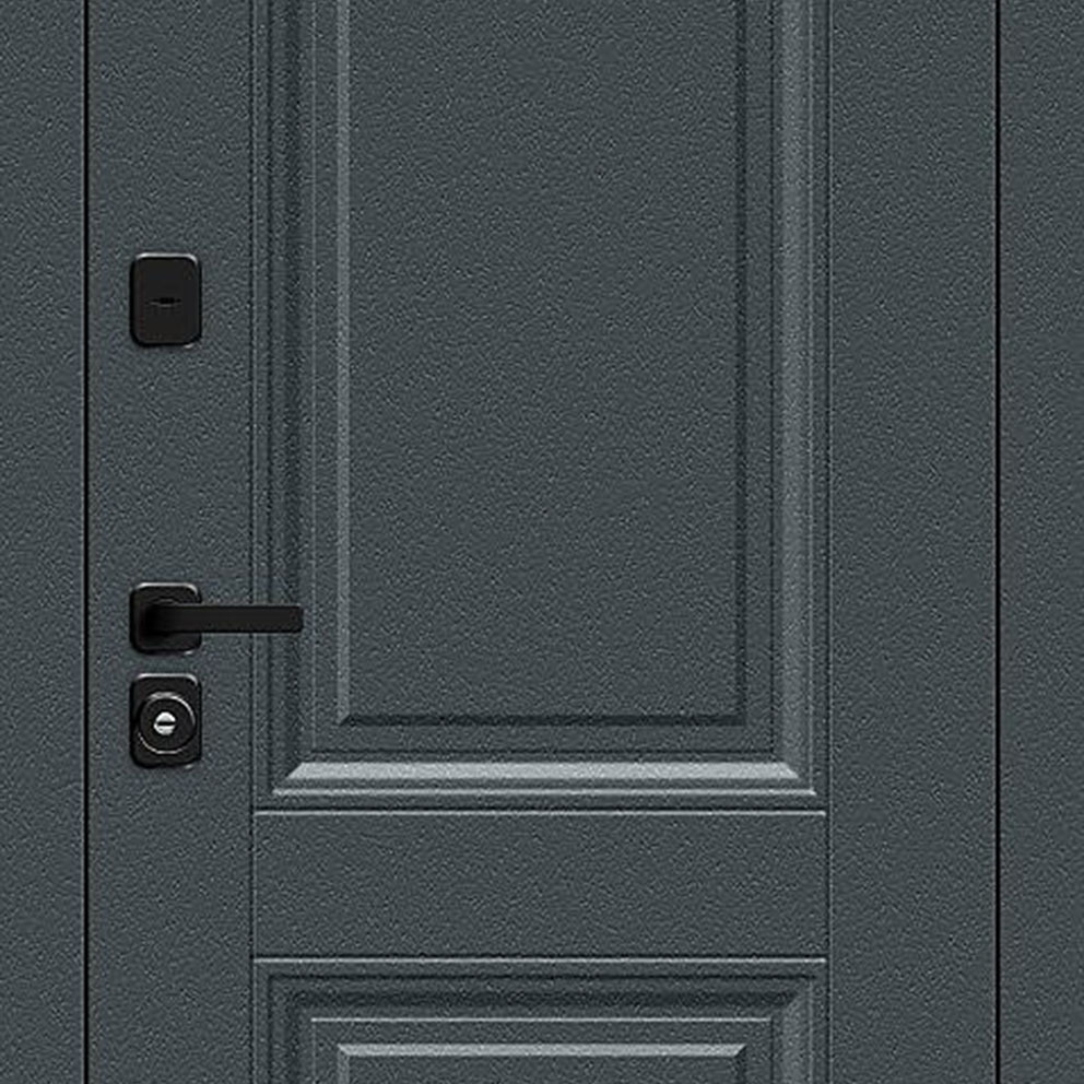 - дизайн внешней стороны: стальной цельнопрессованный лист «Monolith» с декоративным тиснением, обеспечивает повышенную прочность и защиту от коррозии (в отличии от дверей с «металлофиленками»), цвет - "Старк антрацит";