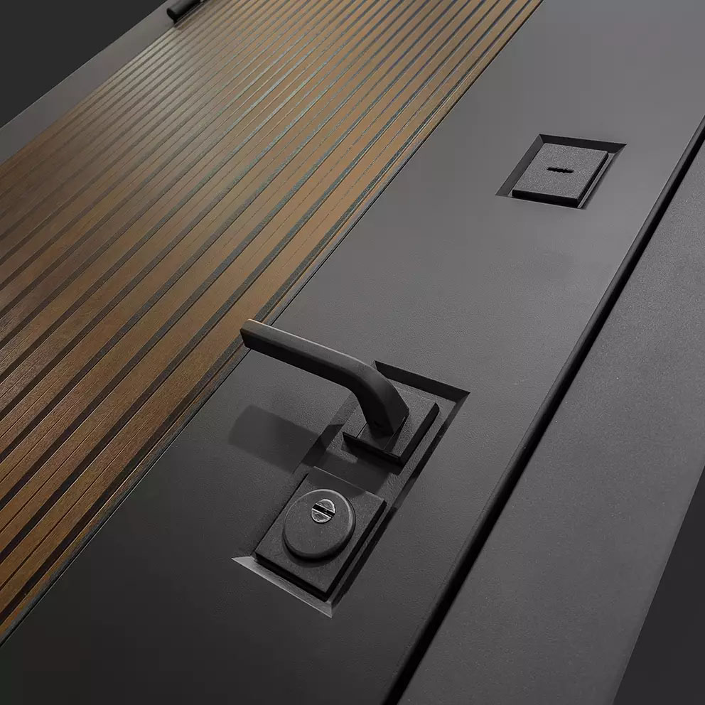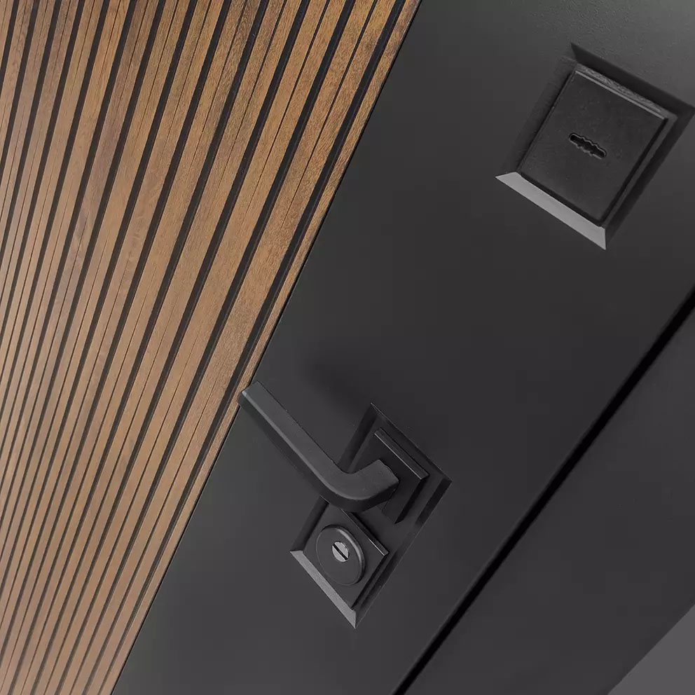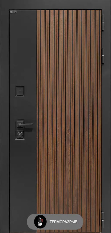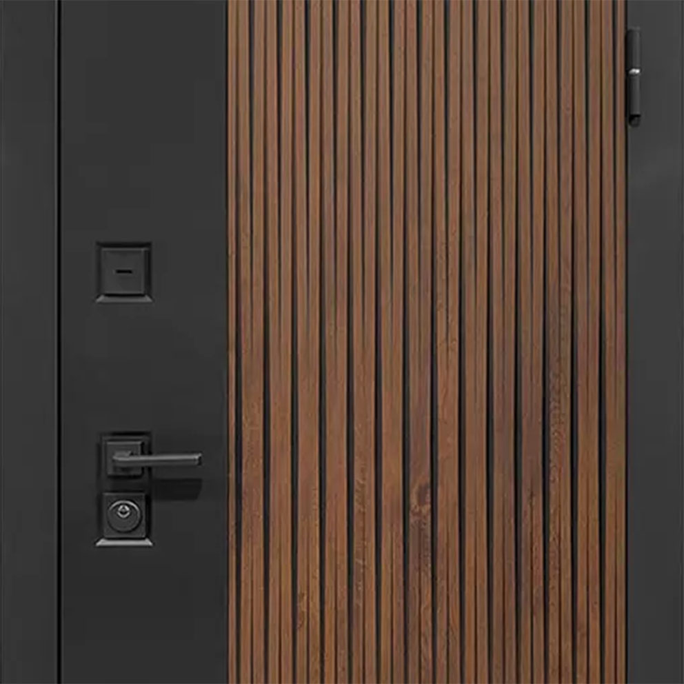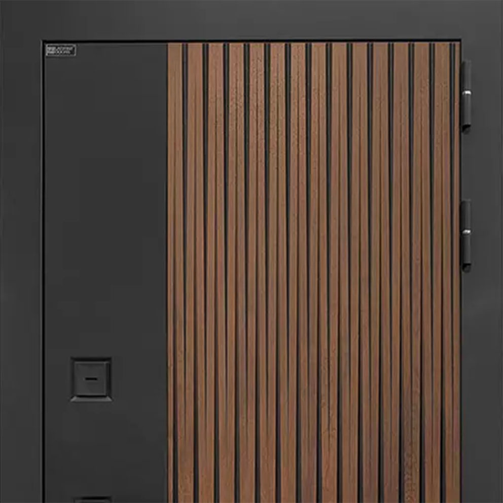- отделка внешней стороны двери: влагостойкая МДФ-панель толщиной 12 мм, комбинированная в цветах "Мэджик Блэк Силк" и "Орех Грецкий" с патиной;