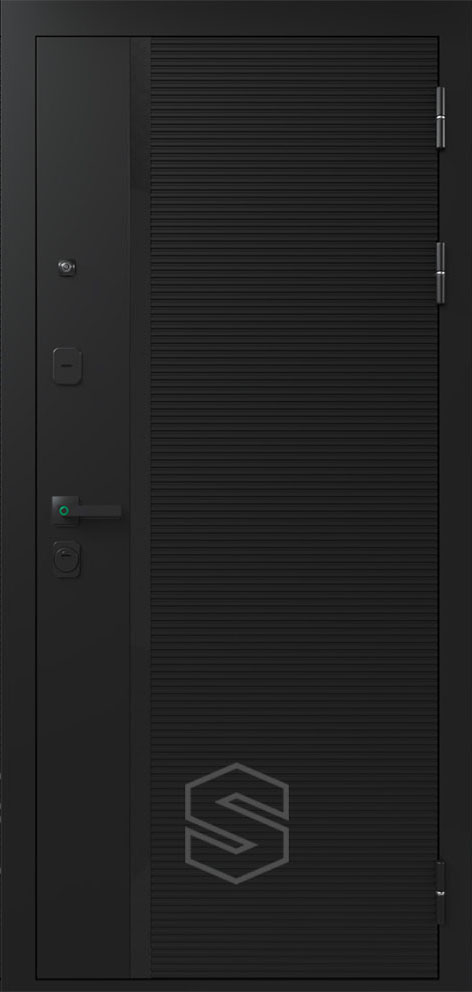 - внешняя сторона дверного полотна - МДФ панель толщиной 10 мм черного цвета "Сатин" + вставка из стекла, наличники МДФ в цвет внешней панели;
